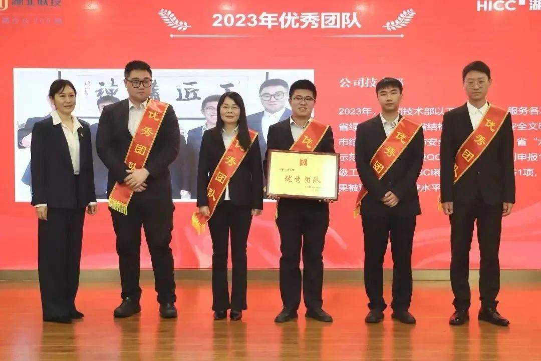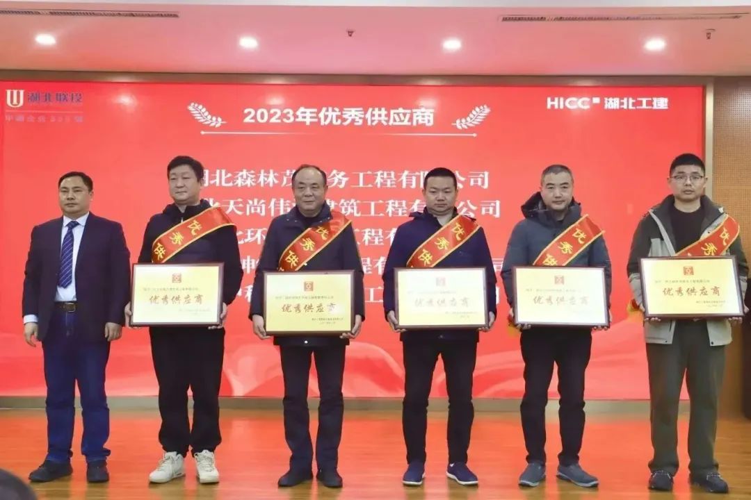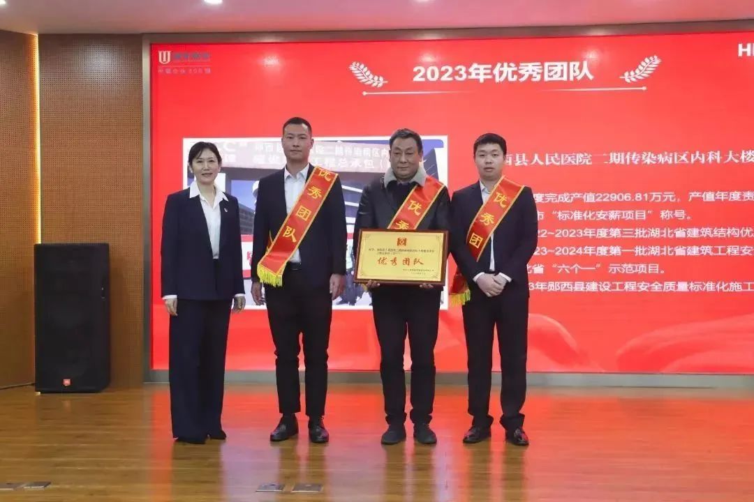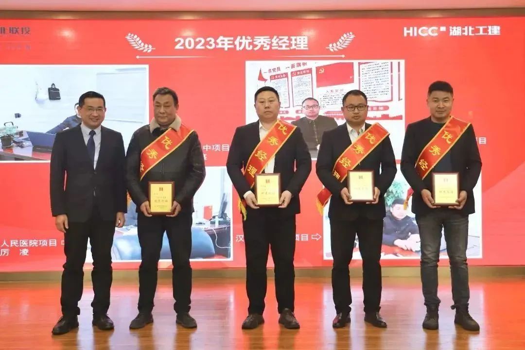 胡超宣讀了《關于表彰湖北工建基礎設施建設有限公司2023年度先進的決定》,公司領導班子成員依次為獲得2023年度“優秀團隊獎”“優秀供應商”“優秀經理獎”“優秀員工獎”“新人成長獎”“安全生產先進個人獎”“質量管理先進個人獎”的代表頒發榮譽證書和獎牌。